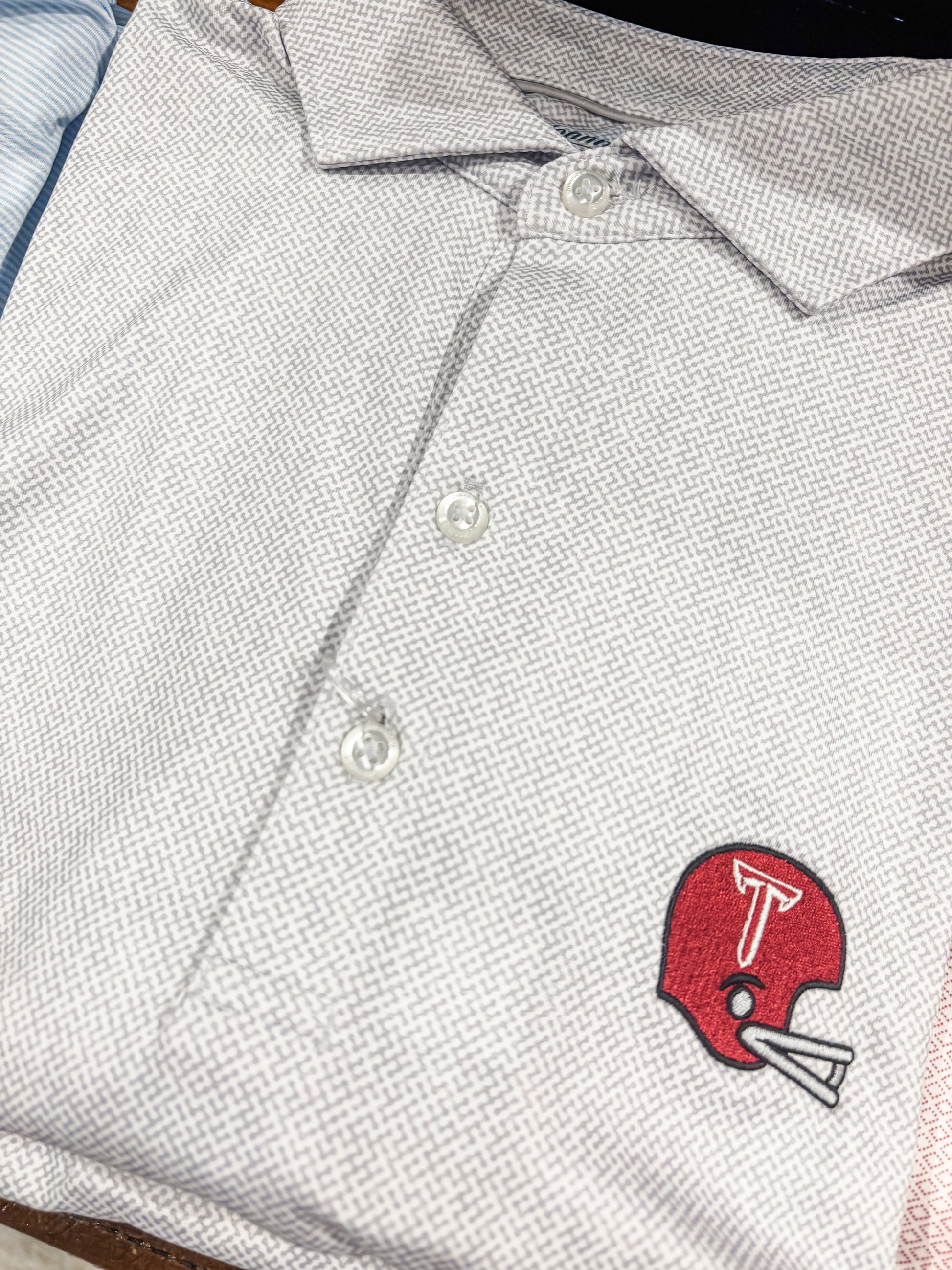 The Hinson Helmet Power T Polo from Johnnie-O is a performance jersey polo designed for both style and functionality. Crafted from a blend of 93% polyester and 7% spandex, it offers a lightweight and breathable fit with moisture-wicking properties to keep you comfortable. The fabric also provides UPF 50 sun protection and features 4-way stretch for ease of movement. Its "non-solid solid" print adds a subtle texture, distinguishing it from standard polos. The shirt includes side vents for added breathability and an embroidered logo at the back neck. Ideal for golf, casual wear, or game day attire, it combines performance with a polished look.