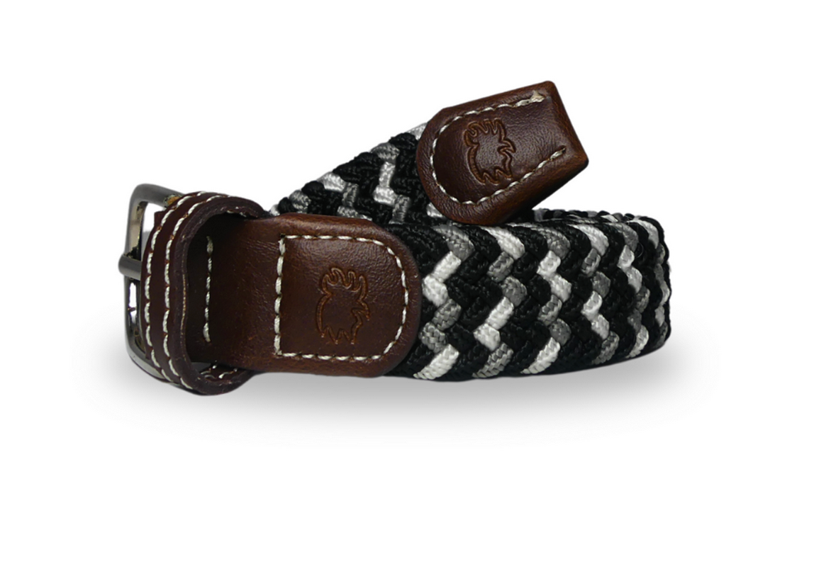 The Lil' Baja kid's tri-color woven stretch belt. Black, white, and gray belt with a rounded buckle and dark brown leather finish stamped with the Roostas logo. An adjustable clasp goes through the woven belt, allowing for adaptable sizing. Designed for comfort both on and off the course.
